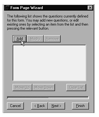 Have no fear. In FrontPage, creating forms is a breeze. The Form Page wizard does much of the work for you. It takes care of the layout and enables you to present questions in several different categories. You think of a question, pick the category that best handles how you want to present it, assign a few variables, and away you go. You can design your IQ test in a matter of minutes.