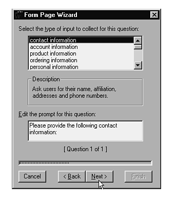 The Form Page wizard is a gem. You use it to design just about any type of form you can think of. If you know the type of form you want to design and the questions or responses you need, the rest is absolutely simple. After you choose the wizard, its introductory screen appears.