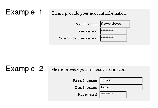 Use an account information question to obtain a user name and password. Account information questions are often used on registration forms, such as those used to gain access to a protected web. A typical prompt is Please enter your name and password in the following fields. Figure 18.5 shows examples of the options available for account information.