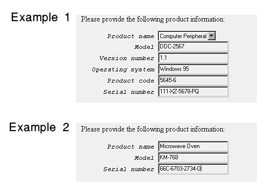 Use a product information question to obtain warranty or registration information on a product. A form for this type of question might be a software registration form or a warranty service request. A typical prompt is Please enter the following information on the product for which you are requesting warranty service. Figure 18.6 shows the options available.