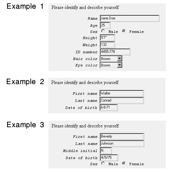 You can ask for personal information in your forms, including age, sex, height, weight, ID number, and hair and eye color. A typical prompt is Enter optional personal information below. Figure 18.8 shows examples of the fields.