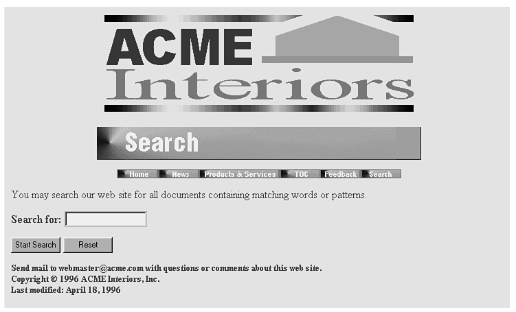A home page is required. If you select a search form, a text search page named search.htm is created at your site. Figure 4.1 shows an example. It enables visitors to your site to search through it for words or phrases. The text search page uses a Search bot, which places a search form with a textbox and two pushbuttons on your page.