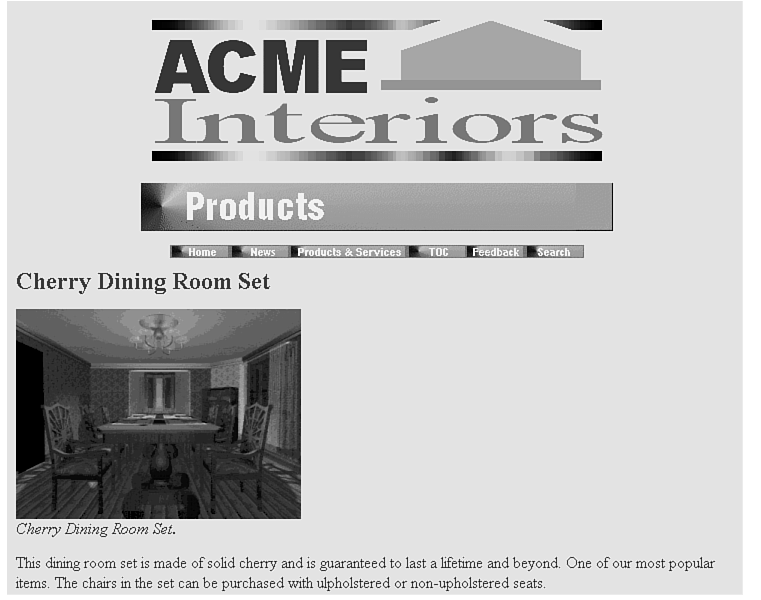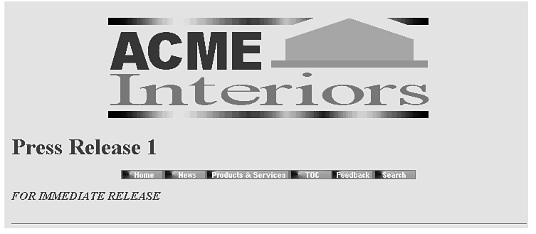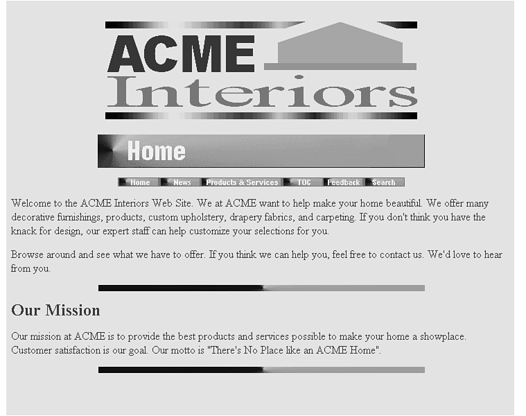 This chapter shows a Web site for a growing interior design firm, ACME Interiors. Its pages include all the available options. With this site as guide, you can start using the Corporate Presence wizard. The steps are