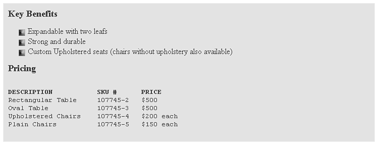 Product data sheets tell visitors to your site about the various products that your company offers. In Figures 4.11 through 4.13, the interior design company advertises one of its furnishings. A section is provided on the page to describe the key benefits of the product. Each product sheet can include