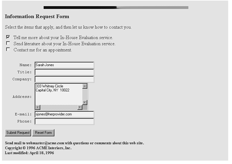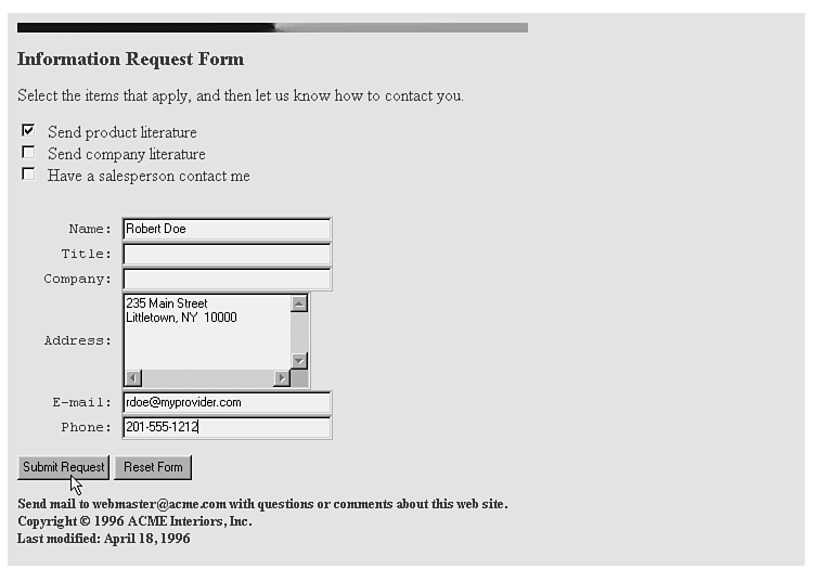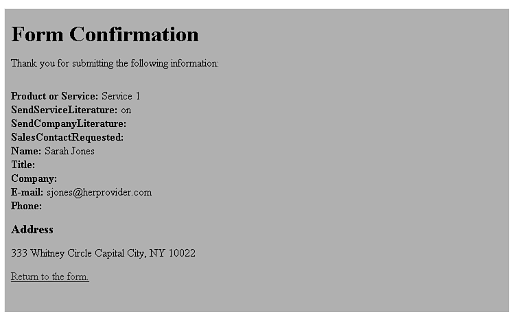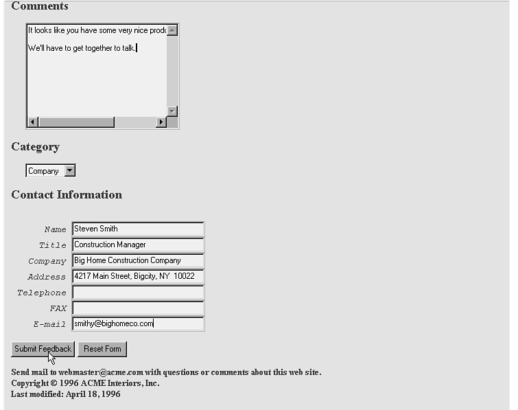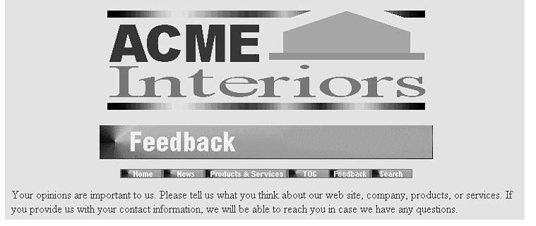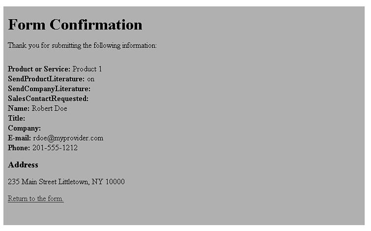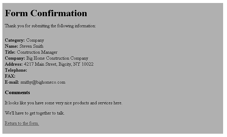 When users submit information to your site with the feedback form, a confirmation page is generated. Figure 4.21 shows the confirmation page for the interior design company's feedback form.