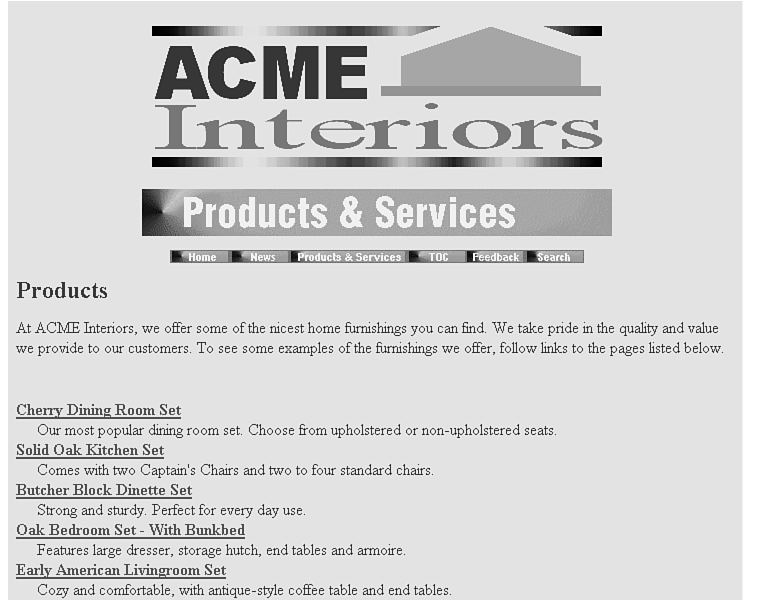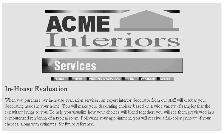Figures 4.9 and 4.10 show an example of a completed Products and Services page. In the upper portion, shown in Figure 4.9, you see a brief description of the products that the interior design company offers and links to the five pages specified in the wizard screen. In the lower portion of the page, shown in Figure 4.10, you see a brief description of the services that the company offers and links to the three service description pages. The footer appears at the bottom of the page.