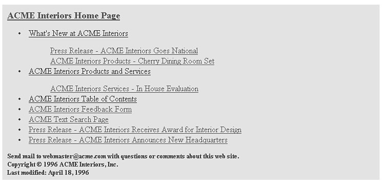 If you elect to have a Table of Contents page in your web, a screen asks what options to include in it. Figures 4.22 and 4.23 show the table of contents that is automatically generated by FrontPage for the interior design company's site.