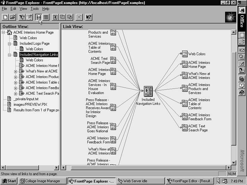 Figure 4.26 shows the Corporate Presence Web pages displayed in the FrontPage Explorer's Link View. The cursor indicates the icon in the toolbar that you click to select this view.