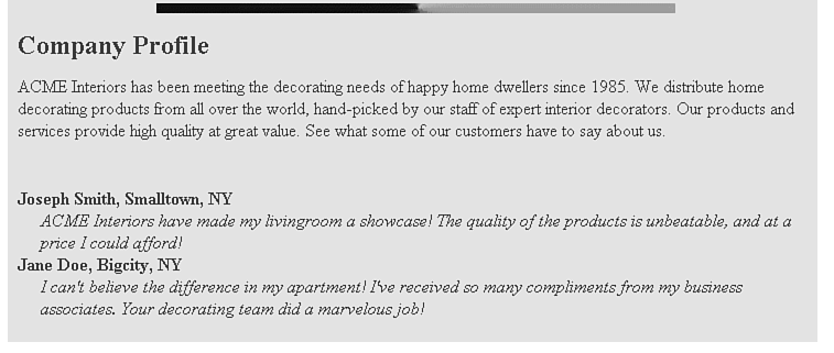 Service description pages tell visitors to your site about the various services and capabilities of your company. A section is provided on the page to describe the key benefits of its products. Figures 4.15 through 4.17 show a service description page at the interior decorating company's site.