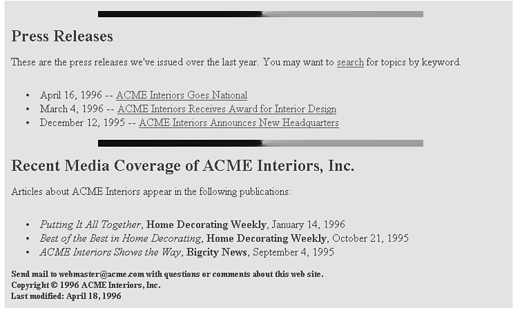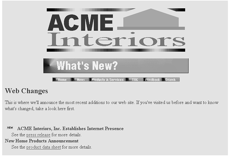 If you elect to include a What's New Page in your Web site, you select options for it in the fourth screen. Figures 4.5 and 4.6 show the completed What's New page for the interior decorating company. The options for this page are