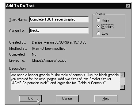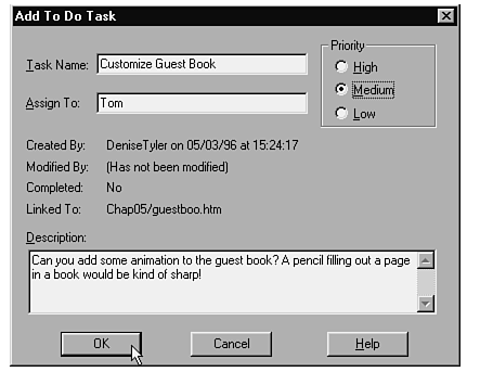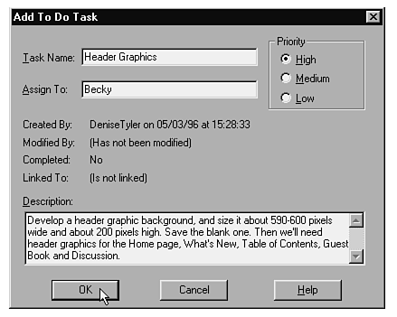 The Add To Do Task dialog box enables you to assign a name for the task, assign an author, prioritize the task, and describe what is to be completed on the page. To add this information: