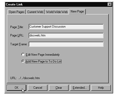 In Chapter 8 "Getting from Here to There," you learn how to create a link to a new page. You can add this new page to the To Do list rather than edit it immediately. You do this with the New Page tab of the Create Link dialog box. From this dialog box, click the Add New Page to To Do List button. (See Figure 7.5.)
