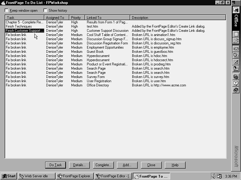 To complete a task, it is best to open the page from the To Do list itself. It is much easier to keep track of the tasks this way. This is a good habit to get into if many authors work on the same web. The To Do List tracks who is assigned to a page or a task.