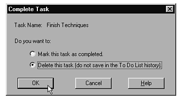 When you add tasks to your To Do list, keep the list as compact as possible. For example, if five items on a page need to be completed and you are responsible for three of them, bundle those three tasks into one description. You can always edit the description after you complete one of the tasks. Otherwise, you can imagine how big a To Do list can get if you enter five tasks for each of 100 pages. In that case, the To Do list would be managing you. Remember: The To Do List is there to save you time-not to create more work.