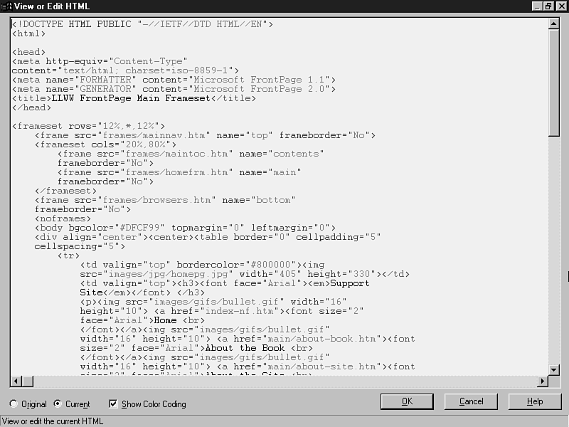 When you want to view or edit your HTML code, choose the View | HTML command in the FrontPage Editor. The View or Edit HTML window, shown in Figure 17.1, appears. This editor is a color-coded HTML editor, where HTML tags are displayed in purple, attributes are displayed in blue, attribute values are displayed in green, and page content is displayed in black. You can disable the color coding, if you prefer, by unchecking the Show Color Coding option located at the bottom of the View or Edit HTML window.