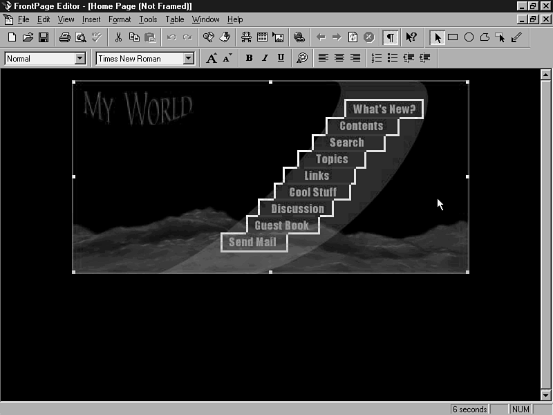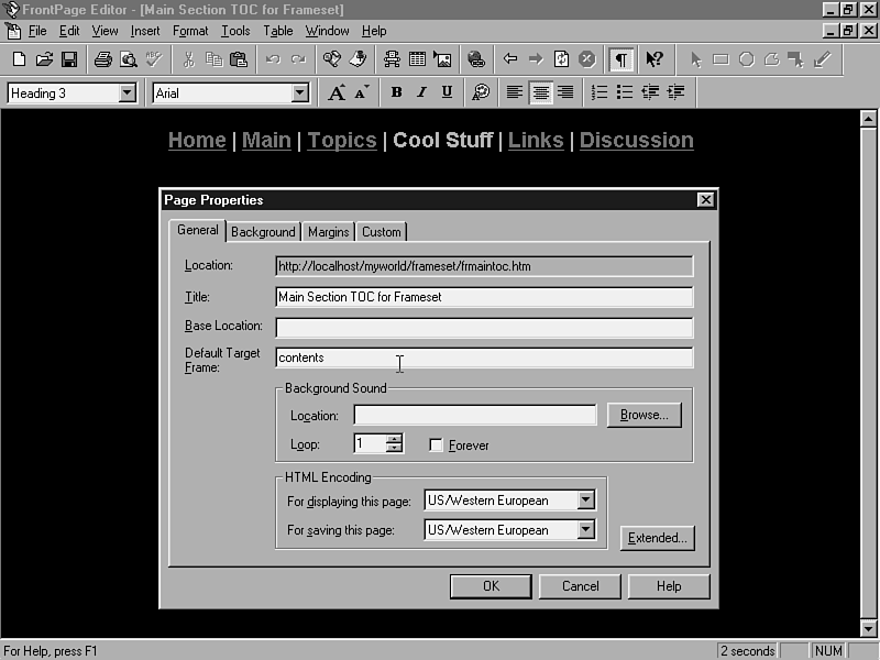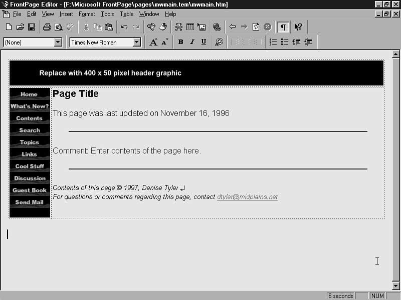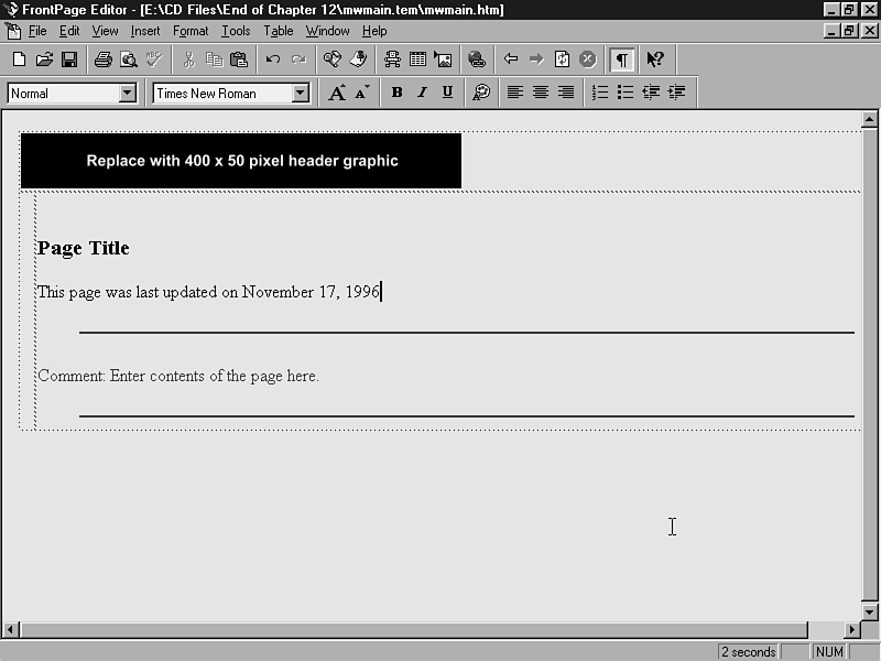 FrontPage\pages\mwmain.tem directory. Select mwmain.htm