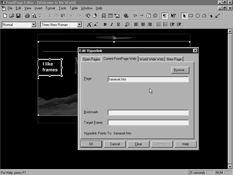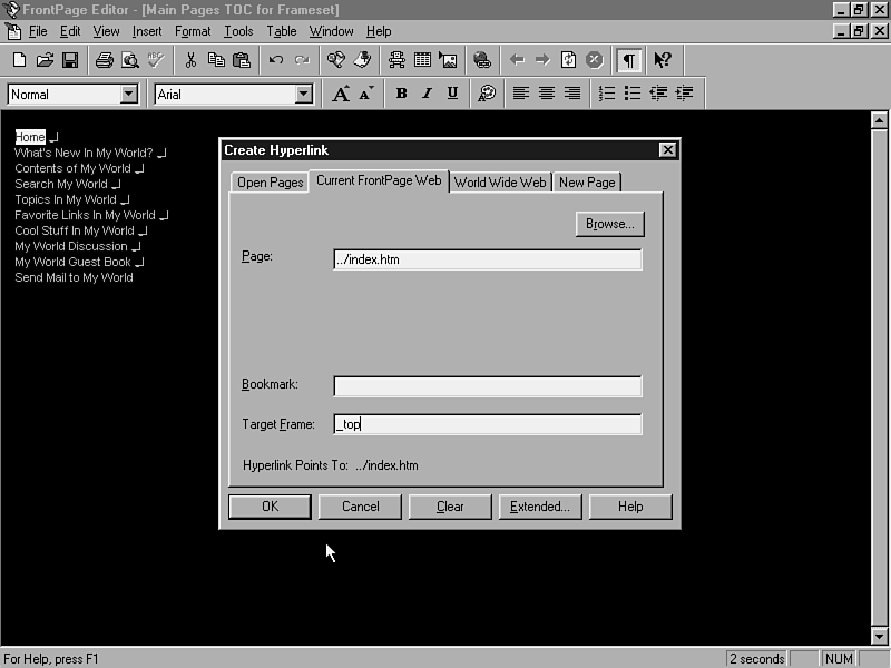(Main Pages TOC for Frameset). You return to the Create Hyperlink
