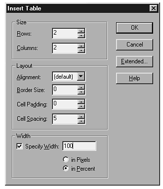 Figure 18.3 : Add a table at the beginning of your main page template, and set its properties in the Insert Table dialog box.