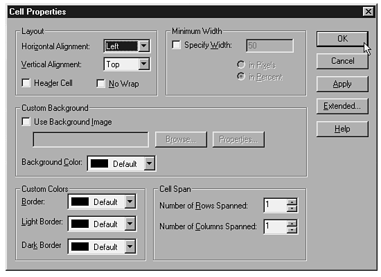 Figure 18.4 : Select all the cells and assign properties in the Cell Properties dialog box.