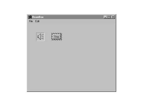 Test the looping property by setting it to true and then clicking the bean. You should hear the musical audio clip repeat over and over. Unfortunately, you can't stop it because the BeanBox doesn't give you a direct means of calling methods. However, you can wire a button to the stop() AWT response method, which has the same effect as calling the public stop() method directly. Try this by adding a fancy button bean to the container window with its label set to Stop. Figure 13.5 shows how the main container window looks with both of these beans added.
