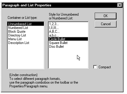 There will be times as you're creating your Web page when you'll need to make a list: either a list of instructions or a list for showing a large number of items in an orderly fashion. Whatever the case may be, you'll need to use the HTML list element. The two most common list types are the bulleted list and the numbered list. You can access more list types by clicking Properties Paragraph and Lists (see fig. 27.10).