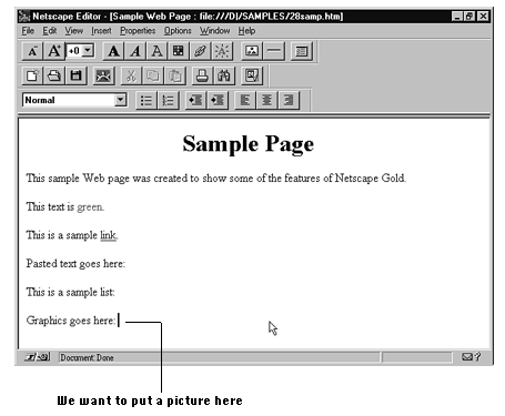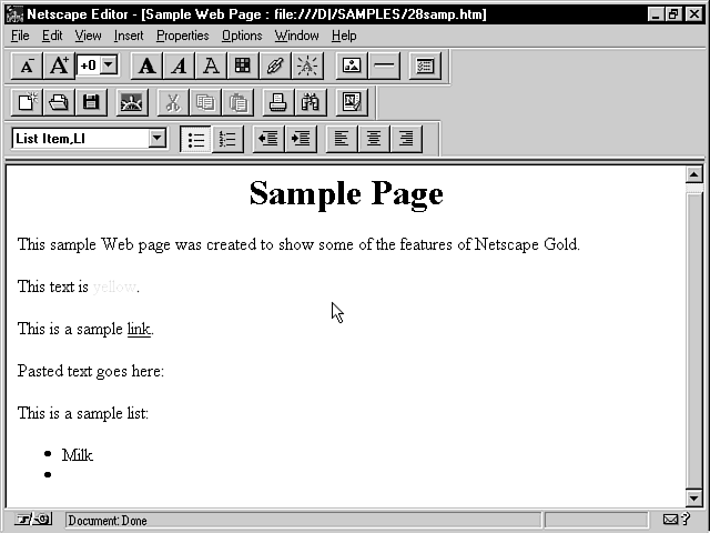 Because Web pages are made up of many elements-text, images, and lists-Netscape Gold must provide for all of these. Fortunately, the basic HTML tags are admirably supported by Netscape Editor. Currently, the most commonly used HTML tags are easily accessible through the three toolbars. The less common elements can be found under the menu headings of the editor.