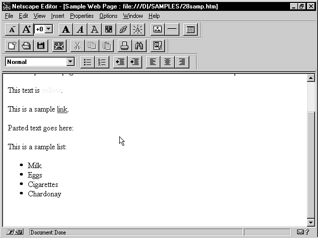 If you have already typed in a list without the list element, don't worry. Converting an existing list into an HTML list is also easily accomplished. Highlight the text in your Web page that you want to make into a list, and click the appropriate list button. Netscape will automatically enter list mode, update the elements to the proper list type, and then exit list mode.