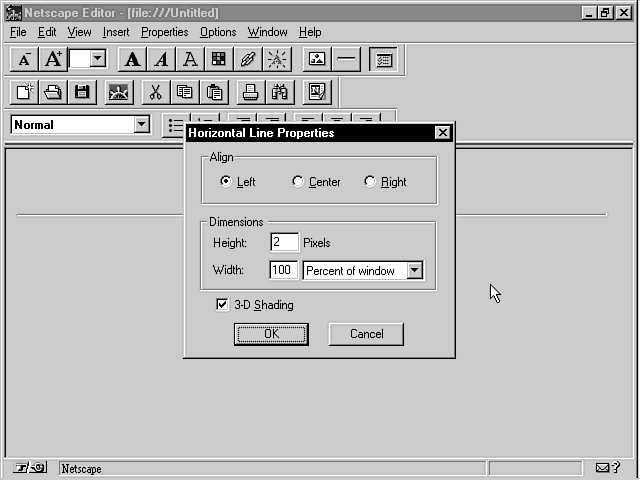 The dialog box allows you to create horizontal rules with different effects. You can specify the horizontal rule's alignment with the three radio buttons. The height of the line is configured with the value in the Height field. The width of the horizontal line is specified by the value in the Width field. You can specify the measurement to be used for the horizontal line by clicking the drop-down list. You can have the width value be either a percentage of the browser's window, or exactly how many pixels wide. The way the horizontal line will look can be specified with the 3-D Shading checkbox. If you disable the 3-D effect, the horizontal rule will be one solid line.