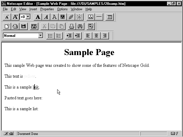 What most WYSIWYG HTML editors do in the case of many elements is to treat the elements as objects. That is, certain HTML elements are treated as separate entities. You can't affect part of the element, you have to make changes to the whole thing. Netscape Gold's built-in HTML editor is different from similar editors in that it doesn't do this. Netscape Gold allows you to easily affect both the element itself, as well as its attributes. You don't need to fumble around with one function that allows you to modify all aspects of the element. You can simply modify whichever aspect you want, independently of all other aspects.