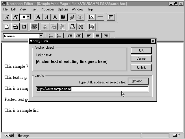 Figure 27.15: With Netscape Editor, we put our cursor anywhere in the hyperlink itself.