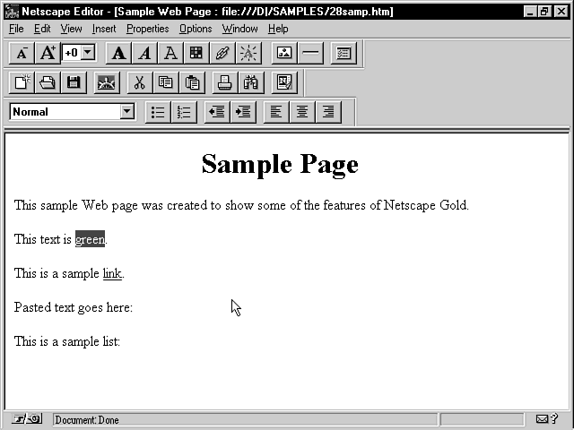 With Netscape Gold, the text that you've cut or copied into the Clipboard maintains its attributes. What this means is that any text you place into the clipboard will be pasted with the same features. If you've copied some visible text from a hypertext link, the link is maintained when you paste it to a new location. Similarly, if you've colored some text, copying and pasting it will keep the color. Suppose we're working on a fairly generic HTML document (see fig. 27.17). While you can't see the color of the text, the word "green" is in green. We simply highlight the "green" portion of the colored text (see fig. 27.18). Now we move our cursor down a bit, and paste somewhere (see fig. 27.19). You'll notice that the pasted text is still in green.