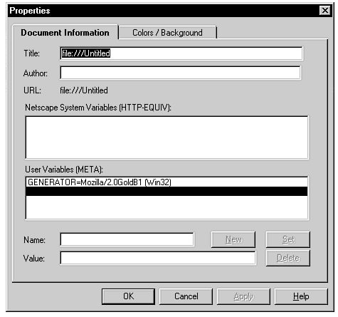 Currently, the Netscape System Variables are not accessible. In the future this region will allow for the creation and editing of special Netscape extensions. The User Variables field is used for people who want to specify META elements. To create a META element, click an existing variable, and click the New button. To edit an existing variable, just highlight the META variable, and the variable name and value will appear at the bottom. Change the value to whatever you want, and click the Set button. To delete a META variable, select it, and click the Delete button.