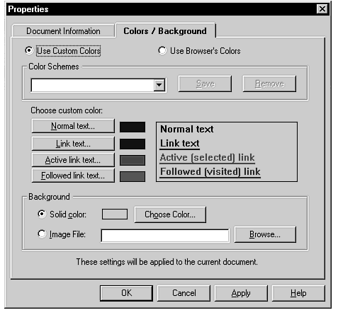 If you already have an HTML document open, changing the default colors will not affect it. To change the colors or background for the current HTML document, see "Defining Your Current HTML Document," earlier in this chapter. |