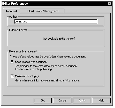 If you're in charge of an entire Web site, you'll want to have a consistent look and feel to each of your pages. You can easily accomplish most of this by specifying the default attributes for your HTML document. Simply select Options, Editor Preferences. This will bring up the dialog box shown in figure 27.22, which is similar to the one that enables you to define document-specific attributes.