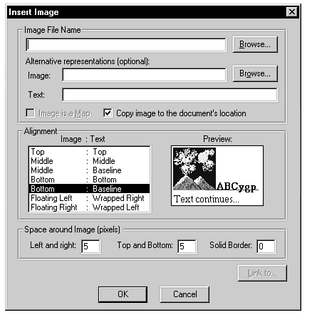 When you insert a graphic, you can also determine how text will behave around it. By default, the text's baseline is aligned with the bottom of the image. You can change this behavior by selecting any of the options in the Alignment section. As you click an option, you'll see how the text will wrap in relation to the image in the Preview area.