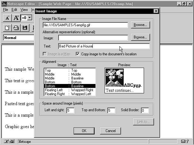 Once you've specified the graphic you want to use, be sure to type some descriptive text in the Text field (see fig. 27.7). This text is what will be seen by people visiting your Web page with a non-graphical browser. Some people with graphical browsers also turn off the capability to see images because they have a slow connection to the Net. Because there are a lot of people who fall into both of those categories, you really should type something into the Text field.