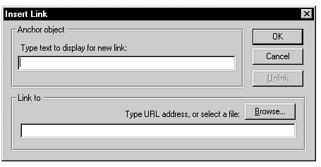 The underlying component of the World Wide Web is the hyperlink. This enables you to take people who are visiting your site to other places of interest. To make some existing text into a hypertext link, simply highlight the text and click the Make Link button. In the dialog box that appears, simply type the URL you want the link to jump to in the Link to field (see fig. 27.8). If you click the Make Link button without highlighting any text, you can enter your desired text in the Type text to display for new link field (see fig. 27.9).