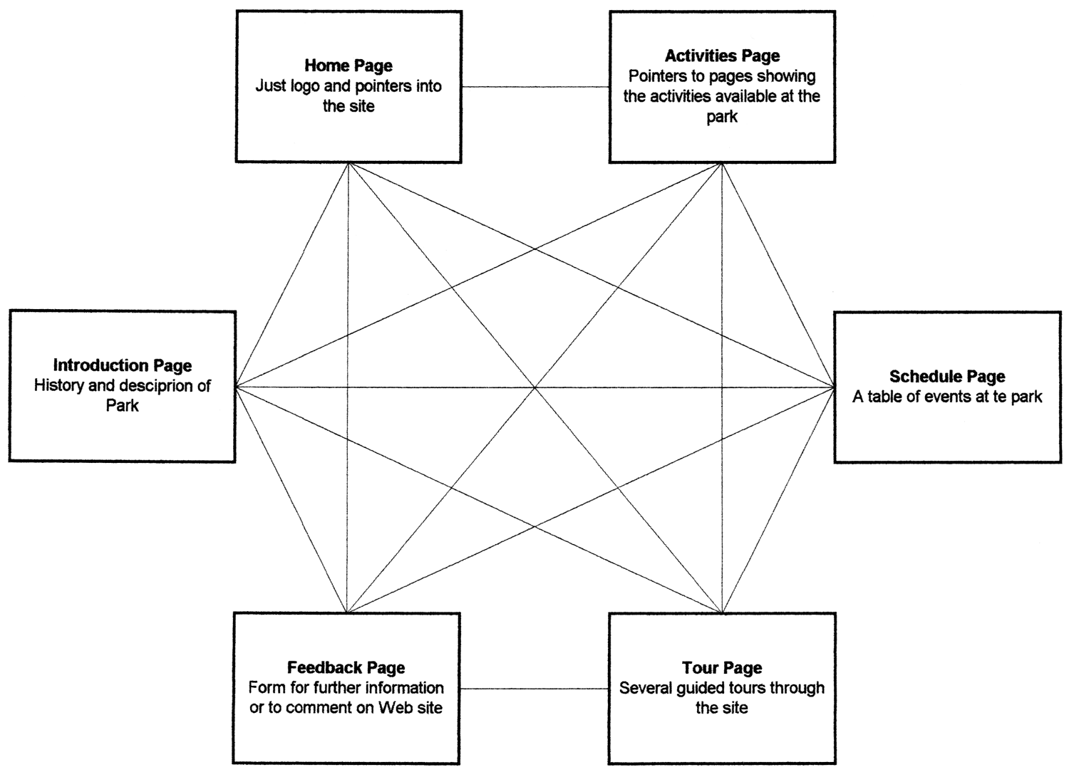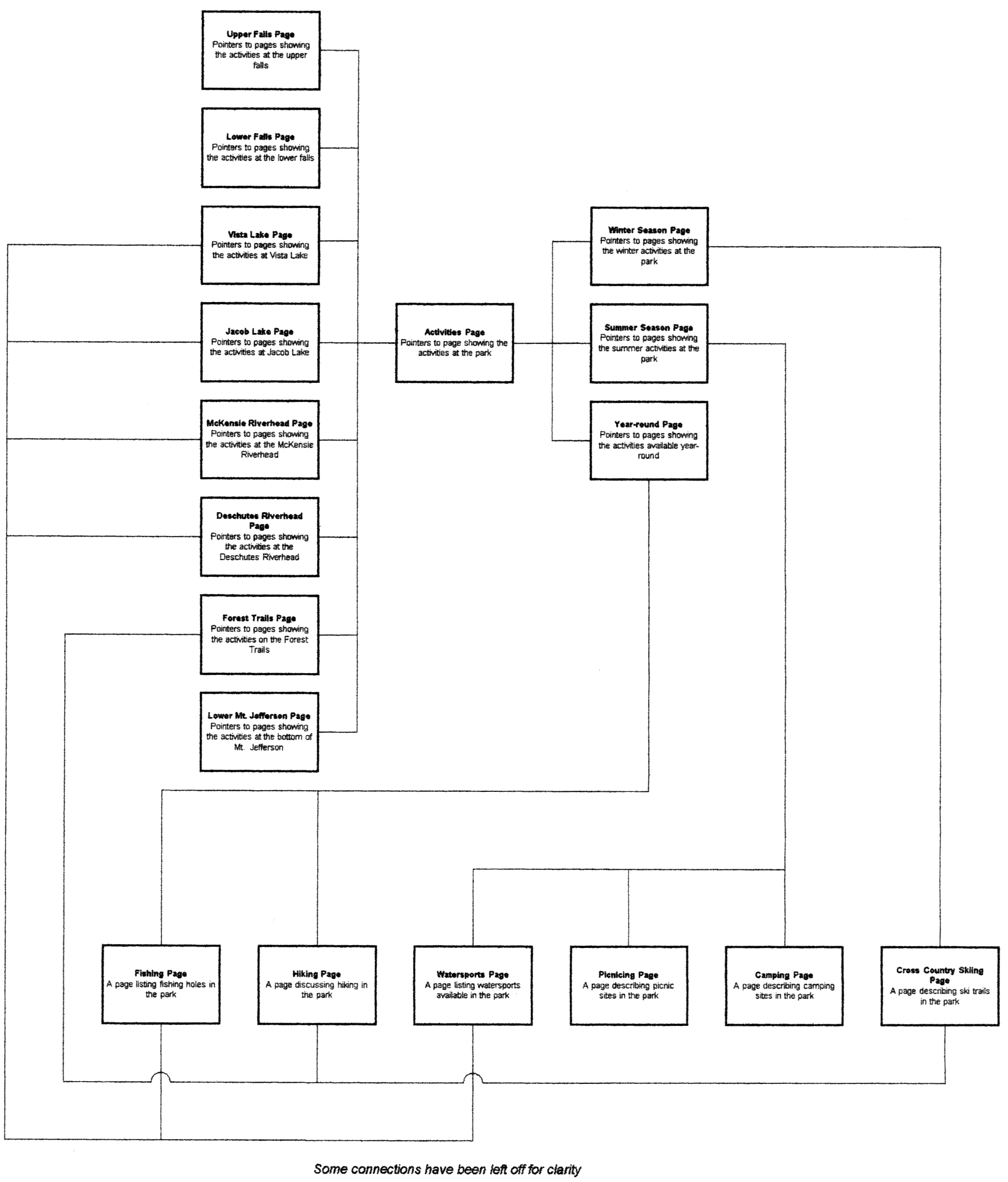 The first task is to create a flow chart for each section to lay out the basic structure of the site. These charts show only the individual pages or subgroup of pages, not the intuitive links users will expect when the pages are distributed on-line. Figure 31.1 shows how the main sections of the site interact, figure 31.2 shows the seasonal schedules and fees section, figure 31.3 shows the index of activities, and figure 31.4 shows the scenic tour.