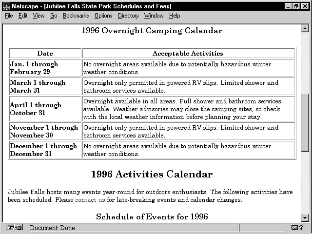 The following code is the Jubilee Falls State Park Schedules and Fees page in HTML (SCHEDULE.HTM).