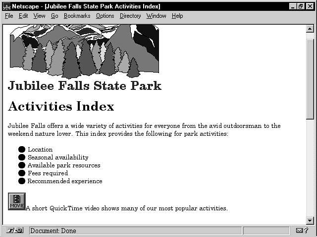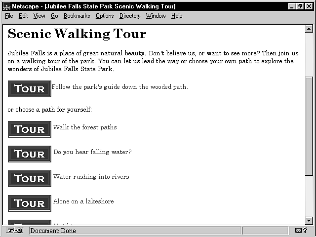 <HTML> <HEAD> <TITLE>Jubilee State Park Guidebook</TITLE> </HEAD> <BODY> <IMG SRC="..\logo.gif" ALT="Welcome to the Jubilee Falls State Park Guidebook"> <P> <H3>Select a menu option:</H3> <P> <A HREF="intro.htm">[Introduction]</A> <A HREF="schedule.htm"> [Schedules and Fees]</A> <P> <A HREF="activity.htm">[Park activities]</A> <A HREF="tour.htm"> [Scenic walking tour]</A> <P> <HR> <P> <A HREF="schedule.htm"><IMG ALIGN=bottom SRC="../schedule_sign.gif"></A> <A HREF="activity.htm"><IMG ALIGN=bottom SRC="../activities_sign.gif"></A> <A HREF="tour.htm"><IMG ALIGN=bottom SRC="../tour_sign.gif"></A> <A HREF="feedback.htm"><IMG ALIGN=bottom SRC="../feedback_sign.gif"></A> <P> <H6>©1996 Jubilee Falls State Park</H6> </BODY> </HTML>