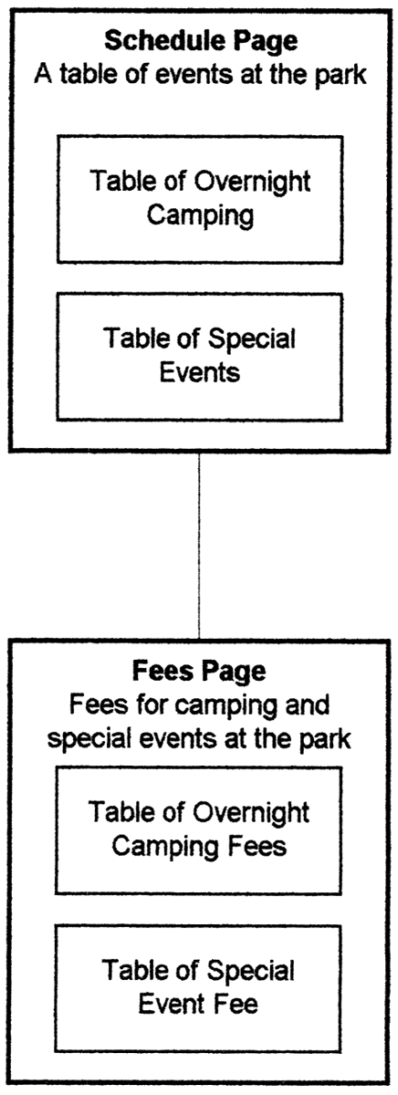 The park rangers have identified four sections for their Web application: the introduction, with a list of services and a history of the park; the park's seasonal schedules and fee and reservation information; a "what's there to do" section, with a list of activities indexed to the park location and when the activity is recommended; and a scenic tour of park images to give users a glimpse of the park's highlights.