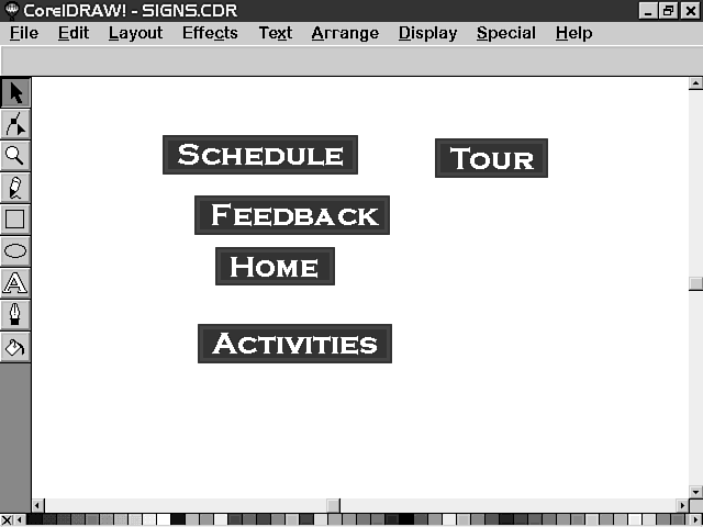 Because you're running CorelDRAW! already, you also can take the time to make some icons that are similar to the signs used at the park to direct visitors (see fig. 31.5). These icons help give your site a visual consistency that's just a little different than other sites. You need to export each of these icons into GIF format as well.