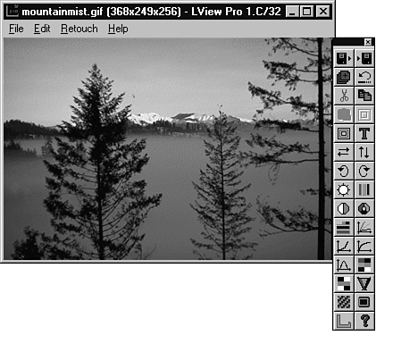 Many of the Web pages will display color photo images of scenic sights and activities. The park hired a photographer last summer to document the park's natural beauty. When the photographs arrived, they were converted to a CD-ROM disc in the Kodak PhotoCD format. You can use an excellent shareware program, LView Pro, to manipulate the photos, as shown in figure 31.6.