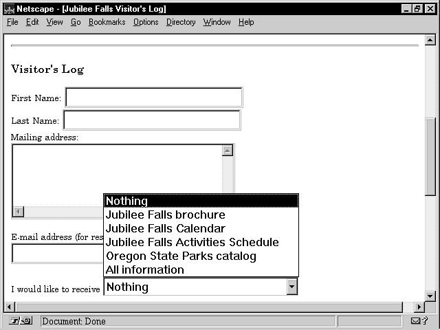 <HTML> <HEAD> <TITLE>Jubilee Falls Visitor's Log</TITLE> </HEAD> <BODY> <IMG ALIGN=middle SRC="../ logo.gif"> <H1>Jubilee Falls State Park</H1> <H2>Visitor's Log </H2> <P> As a public facility, we exist to serve you. Tell us how we are doing, or let us know if you would like more information mailed to you. <P> If you would like to be on our electronic mailing list choose the "Yes" button below - we will keep you informed of special park schedules, special holiday rates and regional activities that might interest you to visit our neck of the woods. <P> <HR> <FORM METHOD=POST ACTION="http://www.jubilee.org/cgi-bin/log_script"> <H3>Visitor's Log</H3> <P> First Name: <INPUT TYPE="text" NAME="fname" SIZE=25 VALUE=""><BR> Last Name: <INPUT TYPE="text" NAME="lame" SIZE=25 VALUE=""><BR> Mailing address: <BR><TEXTAREA NAME="message" ROWS="4" COLS="30"> </TEXTAREA> <P> E-mail address (for responses and mailing list): <BR> <INPUT NAME="email" SIZE=25 VALUE=""> <P> I would like to receive <SELECT NAME="mailer"> <OPTION SELECTED VALUE="nothing"> Nothing <OPTION VALUE="brochure"> Jubilee Falls brochure <OPTION VALUE="calendar"> Jubilee Falls Calendar <OPTION VALUE="activities"> Jubilee Falls Activities Schedule <OPTION VALUE="stateparks"> Oregon State Parks catalog <OPTION VALUE="everything"> All information </SELECT> <P> Enter a message if you wish: <P> <TEXTAREA NAME="message" ROWS="10" COLS="60"></TEXTAREA> <P> I would like to be on your Internet mailing list. <INPUT TYPE="radio" NAME="list" VALUE="yes">Yes <INPUT TYPE="radio" NAME="list" VALUE="no">No </FORM> <HR> <P> Thank you for visiting the Jubilee Falls Guidebook and for taking a few minutes to send us a message. We appreciate your patronage! <P> <A HREF="http://www.jubilee.org/cgi-bin/menu"> <IMG SRC="../graphics/menubar.gif" ISMAP></A> <H6>© 1996 Jubilee Falls State Park</H6> </BODY> </HTML>