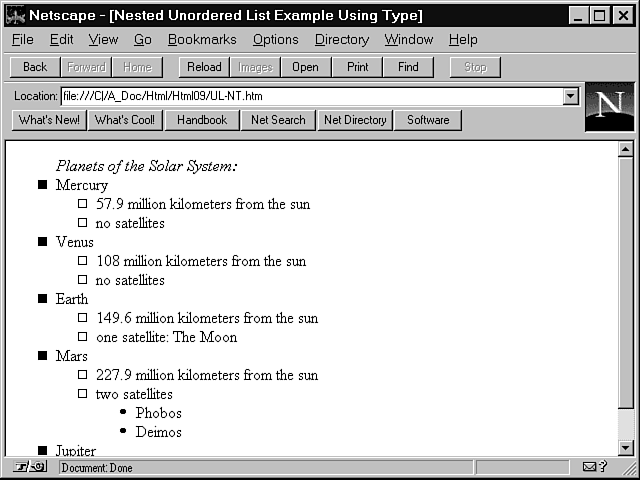The tag extension is TYPE. Figure 9.9 demonstrates its use in an HTML document, which is rendered by Netscape Navigator in figure 9.10. Note that while the tag values shown in this case are "SQUARE" and "CIRCLE," that Netscape Navigator renders them as filled-in and empty squares, respectively.