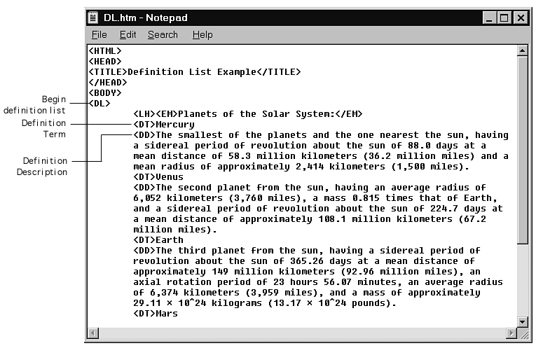The <DT> tag's text should fit on a single line, but it will wrap to the next line without indenting if it runs beyond the boundary of the browser window. The <DD> tag displays a single paragraph, continuously indented one or two spaces beneath the term element's text (depending on how the browser interprets a definition list).