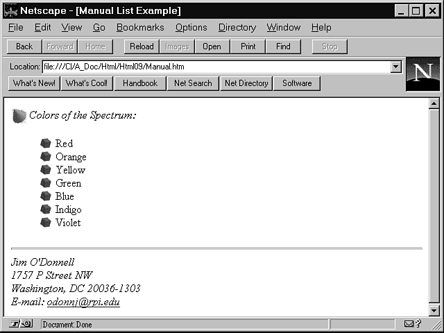 Figure 9.7 shows how to use the <UL> list container. Again, to make the HTML document easier to read, you can include leading blanks and extra lines, but Web browsers will ignore them. Figure 9.8 shows how Netscape Navigator will render this HTML code.