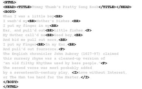 Figure 2.5 shows the <BR> and <P> tags being used to separate the lines and verses of a nursery rhyme and to separate two paragraphs of text commenting on the rhyme. Figure 2.6 is the resulting Web page.