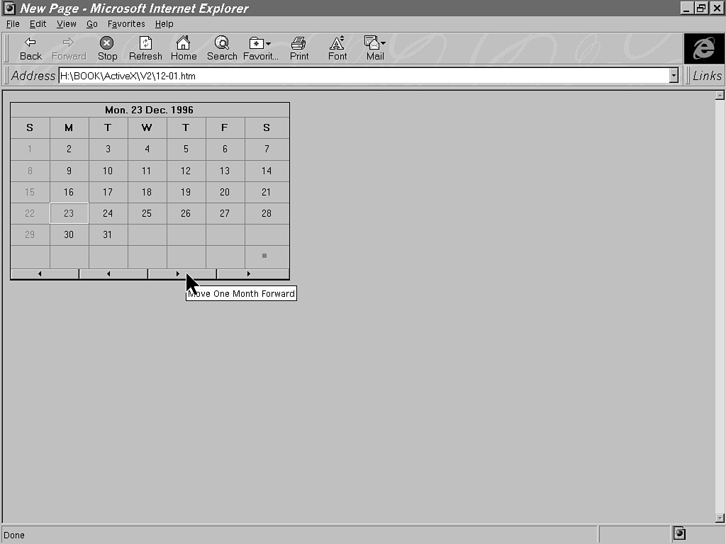 This is a flexible control to implement the display of a calendar in your Web pages. It also has buttons to go to next or previous months and years. You can control the display of the buttons, colors, and more, either during design time or from a script. If your Web pages require the display and manipulation of dates, you should take a good look at this control.