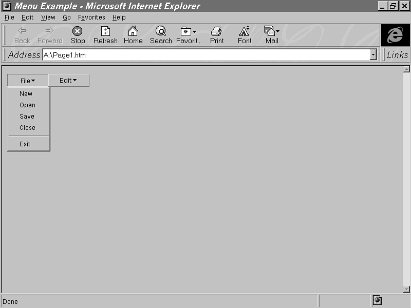 The Microsoft IE30 Button-menu control implements a configurable menu for Web pages. This control is simple enough that you can load and display it quickly. It has good functionality to handle menu-related functions from VBScript or JavaScript.